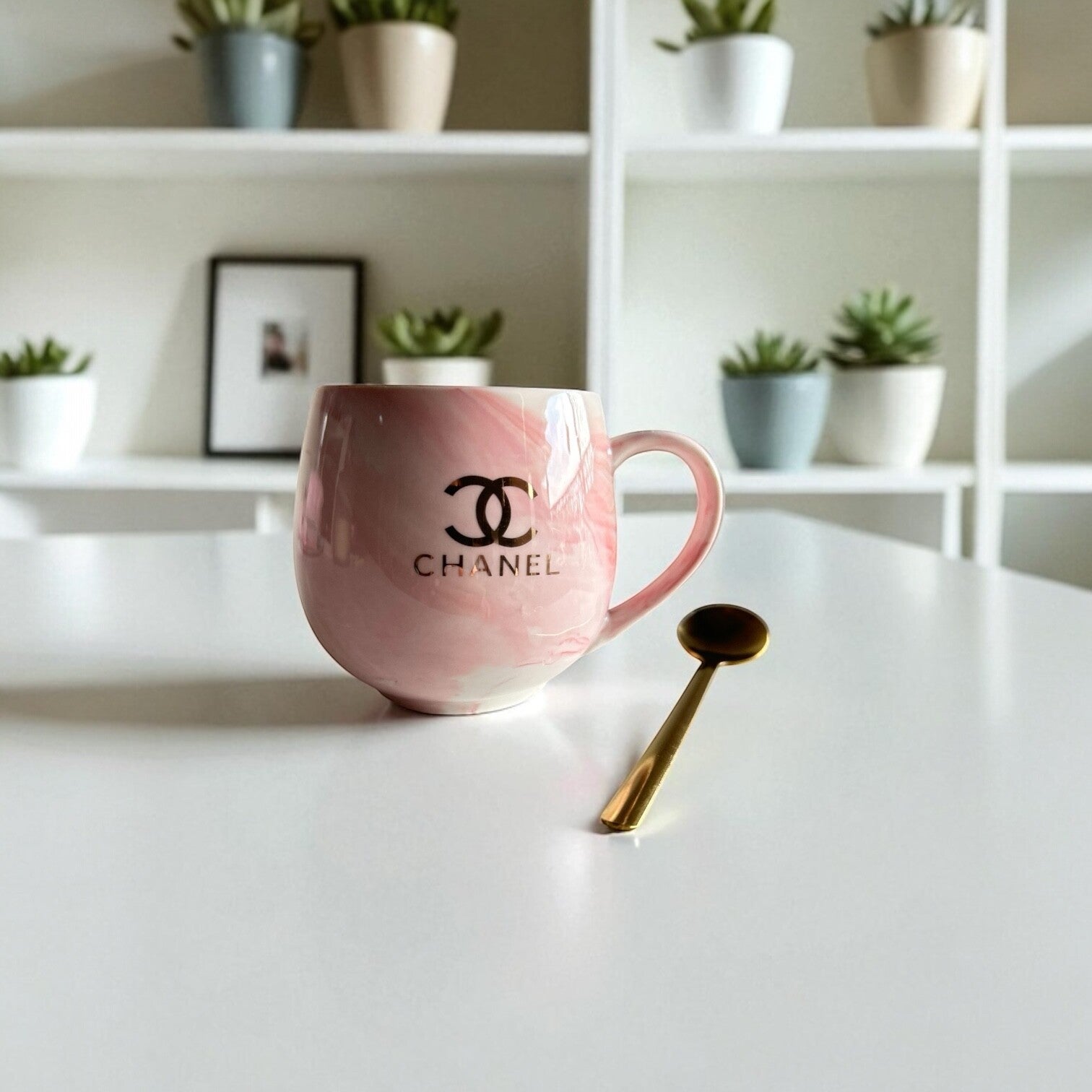 Luxury Pink Marble Coffee Mug with Chanel Logo